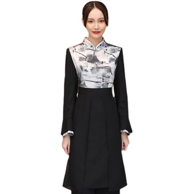 \新作登場!210億の長い秋と冬の新しい中国風ガーゼスカート・レトロでエレガントな作業服!ホテルや中華レストランのウェイター職に最適な一着/