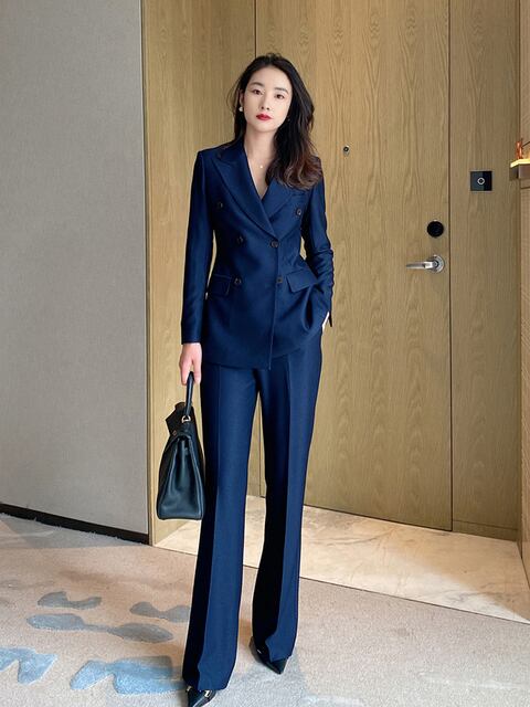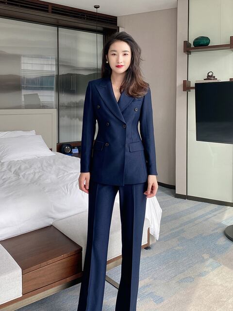 高級ネイビーブルーのスリムフィット気質の背が高くて細いベルボトムパンツスーツが新たにラインアップに加わりました!クールで洗練されたデザインが特徴で、ビジネスシーンからカジュアルなお出かけまで幅広く対応可能なアイテムです。