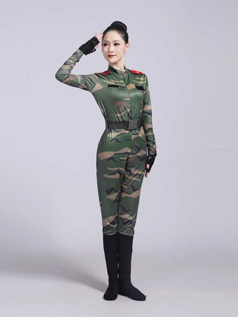 このパフォーマンス服の最大の特徴は、軍隊スタイルをモチーフにした迷彩デザインです!愛国的なテーマが持つ独自の雰囲気を醸し出し、ダンスパフォーマンスに華を添えます。