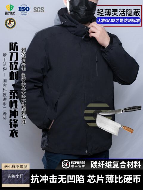 高い防護力を持つ柔軟な防刃ジャケット。柔らかく高度な防刃服。耐切創性、耐ナイフ性。軽量セキュリティジャケット。