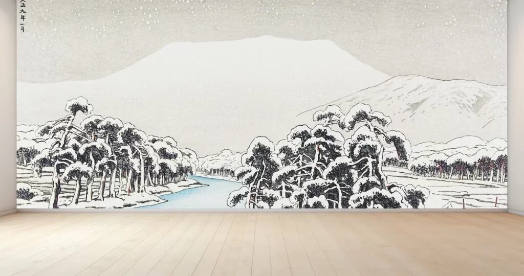 新商品の壁紙アート、「橋口五葉 雪の伊吹山」が登場しました。洋画家であり版画家でもある橋口五葉氏が描いた美しい風景が、あなたのお部屋を彩ります。デジタルプリントされたこの作品は、リアルな雪の伊吹山を思わせる風景が、壁一面を飾ります。モノトーンな色調がインテリアに上品な雰囲気をプラスし、空間を引き立てます。